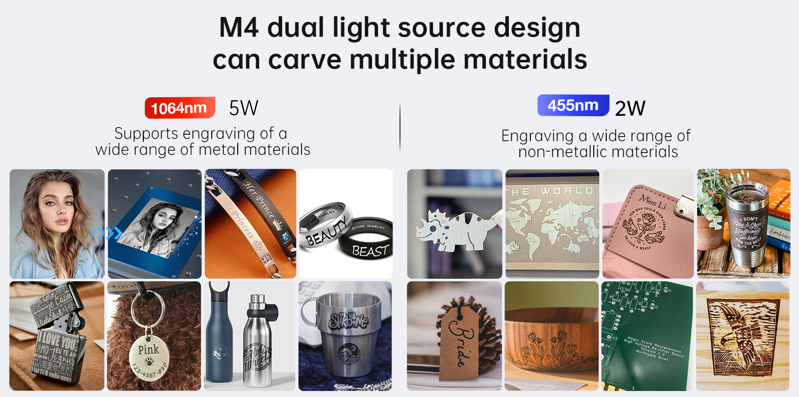 الخشب، الأكريليك، الجلد، الورق، المطاط، بعض المواد البلاستيكية | غير مناسب للمعادن بدون طلاء | أجهزة الحفر بليزر CO2 |